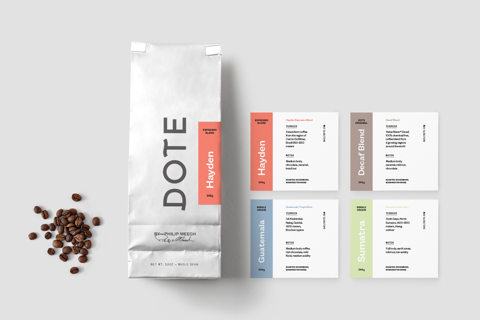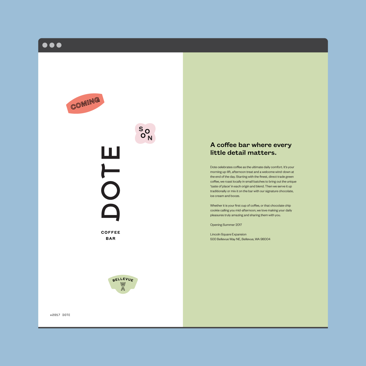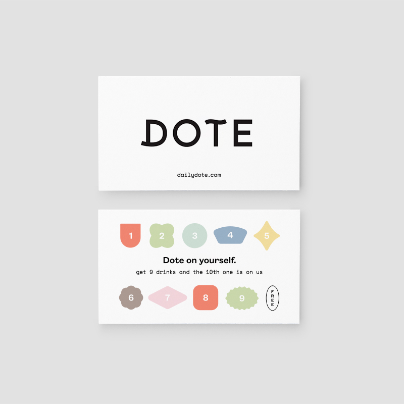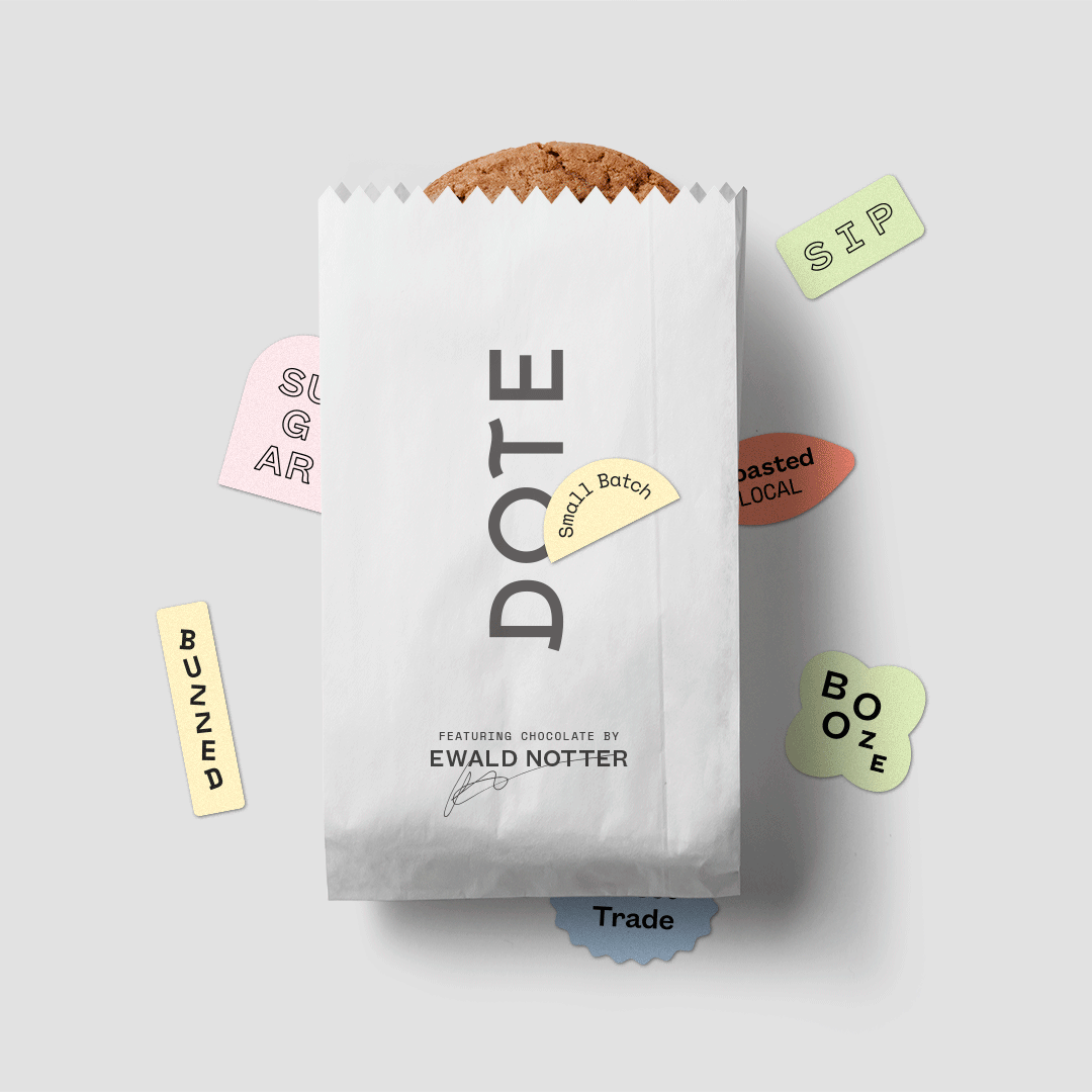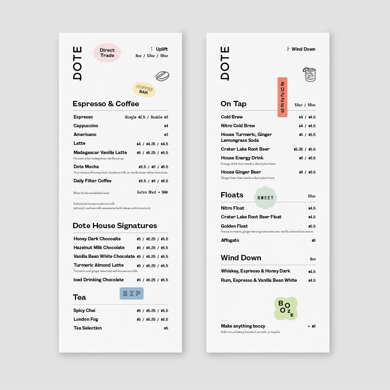 Hum embarked on a comprehensive branding process, beginning with a name and creative strategy. “To dote” is to unabashedly express affection, and Hum developed a brand that visualizes that warmth. Dote’s clean logotype is made delightful with special-touch adornments and colorful badges offering endearing sweet nothings. Hum extended Dote’s refined-yet-playful aesthetic to all brand touchpoints, including signage, menus, packaging, and a web presence.