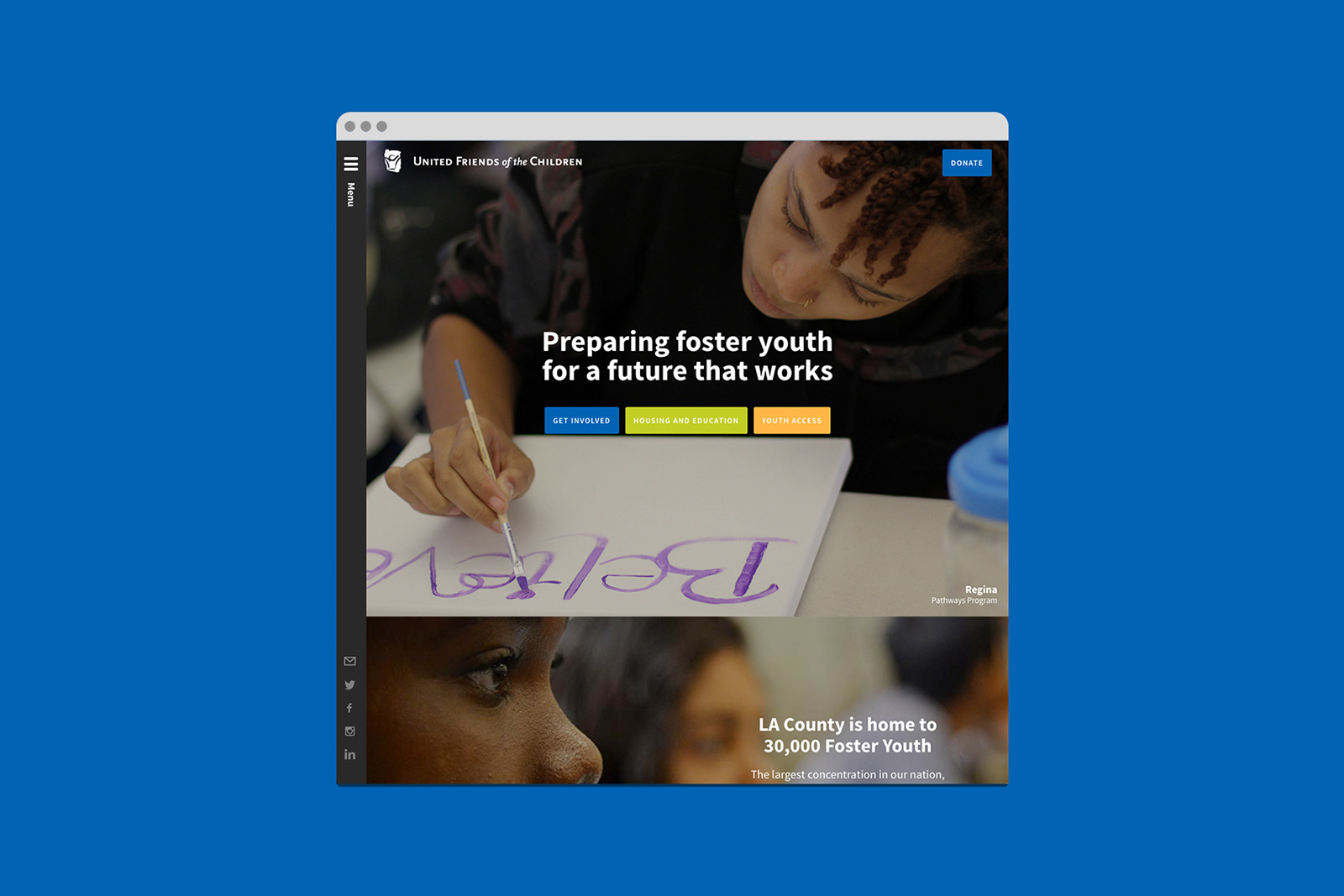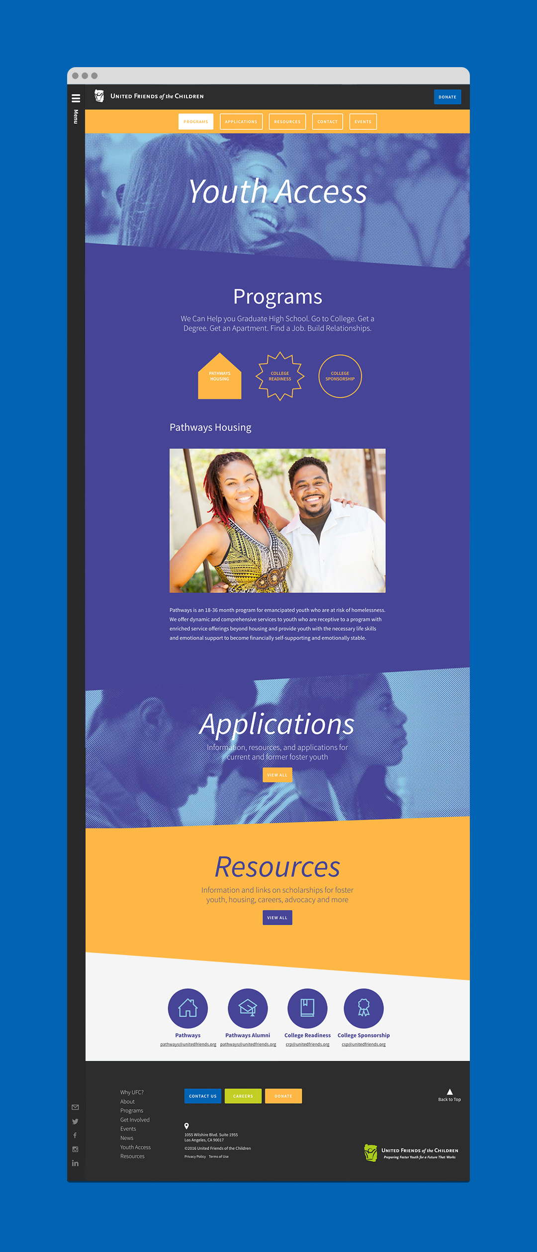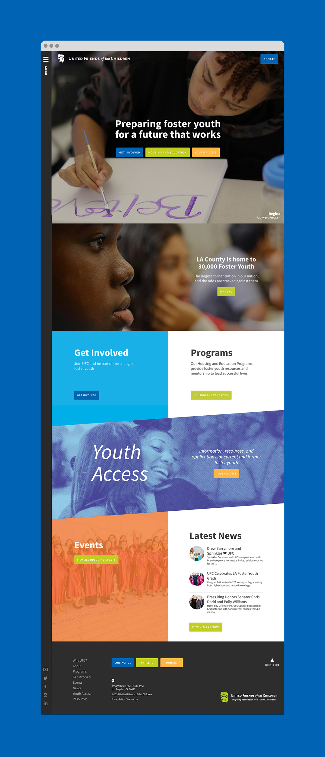 Founded in 1979, United Friends of the Children empowers foster youth through education and housing programs, advocacy, and ongoing support. UFC aimed to increase awareness and understanding of their organization through a new web presence. To meet these business goals, Hum first defined a streamlined content strategy that quickly clarifies the UFC mission and urgently encourages involvement. Next, we designed a site structure that ensures a seamless and helpful web experience for multiple audiences—youth, donors, and the foster community.
