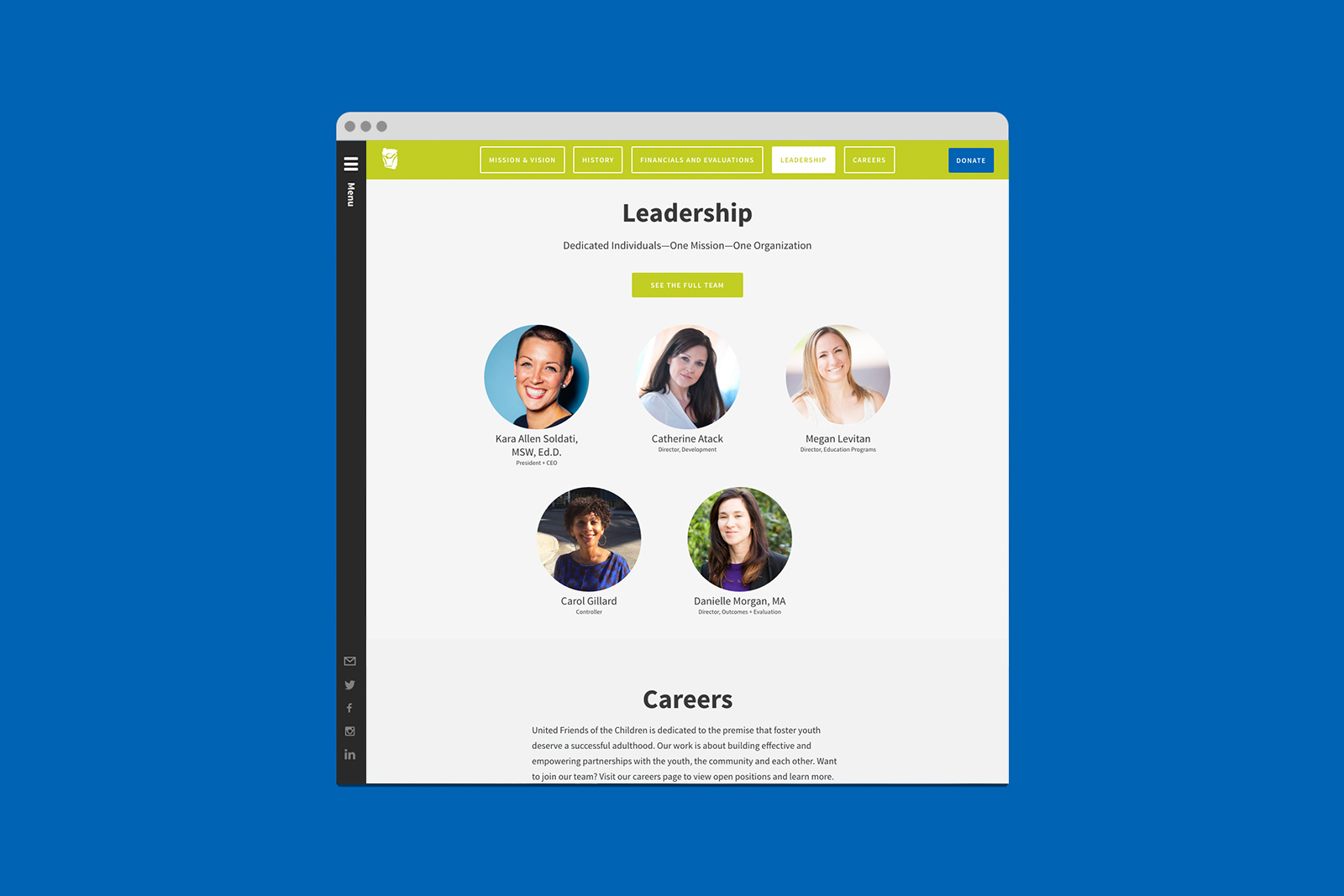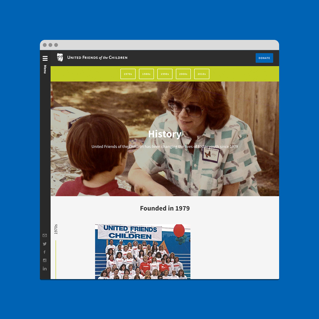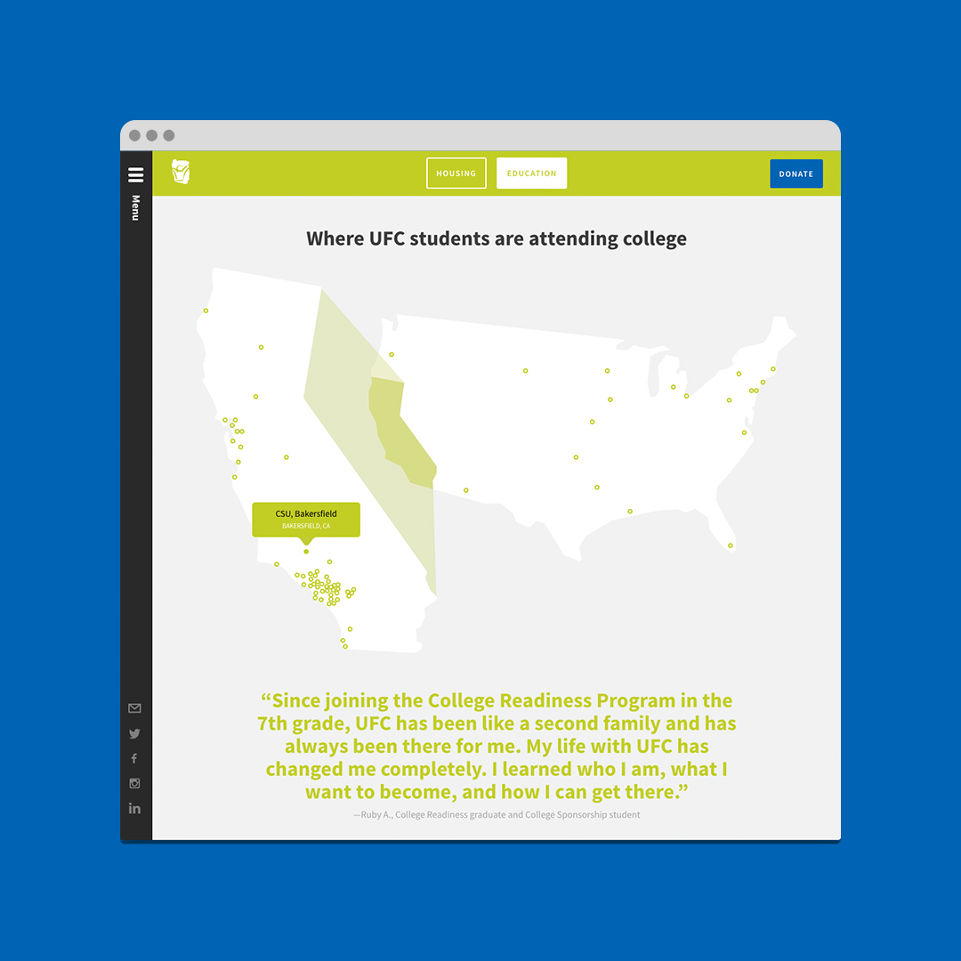Founded in 1979, United Friends of the Children empowers foster youth through education and housing programs, advocacy, and ongoing support. UFC aimed to increase awareness and understanding of their organization through a new web presence. To meet these business goals, Hum first defined a streamlined content strategy that quickly clarifies the UFC mission and urgently encourages involvement. Next, we designed a site structure that ensures a seamless and helpful web experience for multiple audiences—youth, donors, and the foster community.