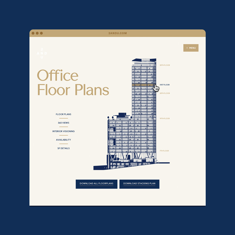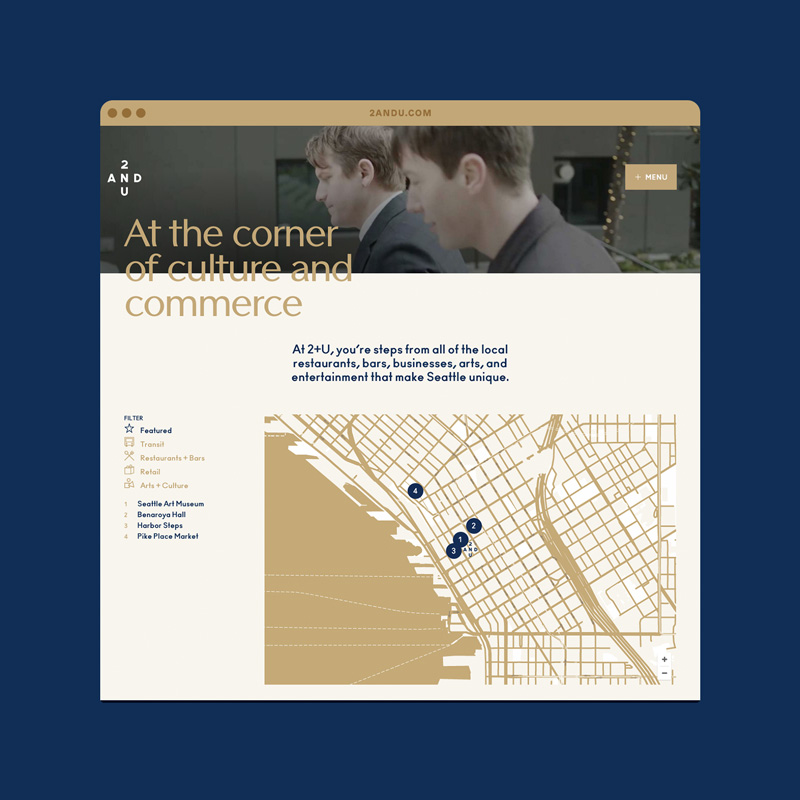 Arriving at Seattle’s waterfront, the website follows an ideal day for 2+U tenants. Inspired copy and lifestyle imagery appeals to young professionals eager for a connection to all that downtown has to offer, while concise supporting information quickly transmits critical building amenities to decision makers.