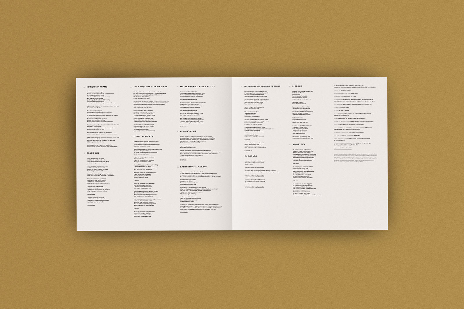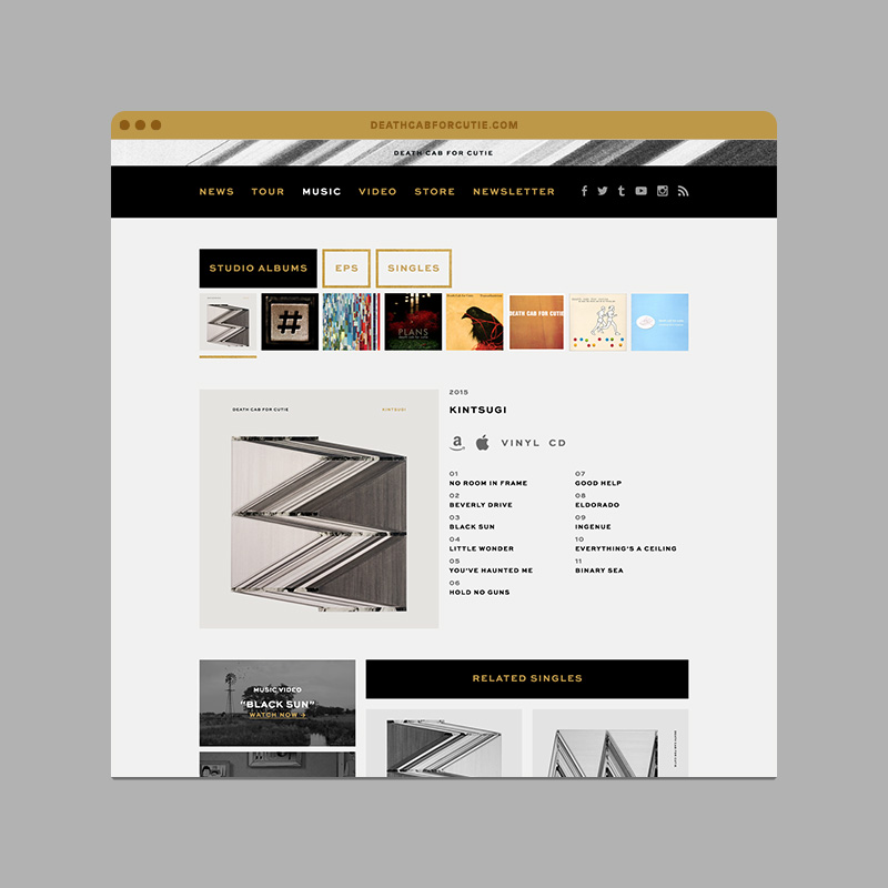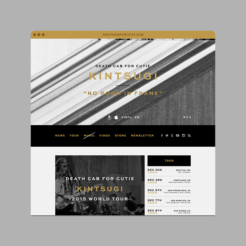 Death Cab for Cutie is a seminal band from Bellingham, Washington, that has been making influential music for almost 20 years. Hum was excited to continue our relationship with the band by designing the packaging, artwork, and website for their eighth full-length album, Kintsugi. Named after the traditional Japanese art of fixing broken ceramics with a combination of gold dust and resin, the title reflects the album’s themes of honoring breakage of the past.